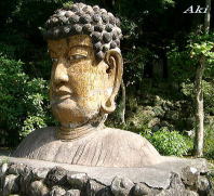 上半身だけのお釈迦さまの像の脇にある丸太風の椅子に腰掛けて、ペットボトルのお茶をゴクゴク!