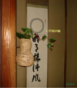 如心斎のお好みでありました道具組で、残月亭の床の間には如心斎筆の円相一軸が掛けられ白芙蓉の花をいけ、天目茶碗にてお供茶(くちゃ)を差し上げます。(下の写真参照)