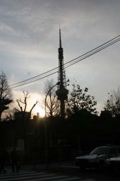 | 曇り空の夕焼けを背景に東京タワーを。 日比谷公園から歩いて芝公園にたどり着きました。 電線が邪魔だなぁ〜〜。 |